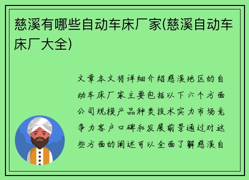 慈溪有哪些自动车床厂家(慈溪自动车床厂大全)