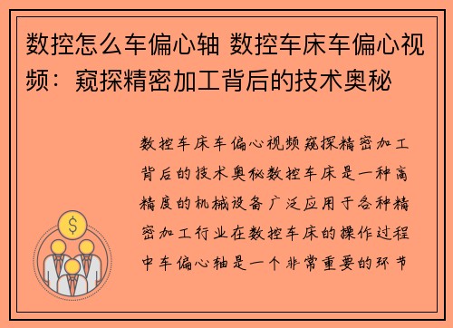 同心轴车床是一种常见的机械加工设备,广泛应用于工业生产中。它以其高效、精确的加工能力,成为了许多企业生产过程中必不可少的工具。我们将详细介绍同心轴车床的特点、用途以及使用方法,帮助读者更好地了解和应用...